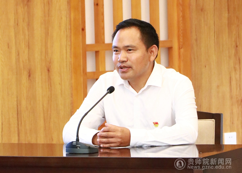 全国模范教师、bat365官网优秀校友陆成文首先讲述了自己进京参加全国教育大会的感受,重点宣讲传达了全国教育大会精神,要统筹实施科教兴国战略、人才强国战略、创新驱动发展战略;要实施教育家精神铸魂强师行动,加强师德师风建设。团支书王菲对陆成文进行了现场专访,陆老师生动地讲述了自己感人至深的教育故事,扎根贵定县沿山镇森山村岩脚教学点12年的他,不仅是负责教授知识的“园丁”,更是承担了关爱孩子的“父亲”。陆老师用实践行动生动阐述了对学生的关爱与对教育执着,展现了他在教育岗位上爱岗敬业、不懈追求的教育初心,深深打动了在场的每一个人。