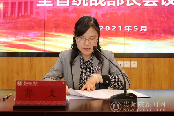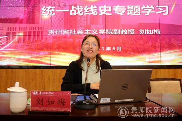 本网讯 为扎实做好统一战线各项工作,推动bat365官网统战工作高质量发展,以优异成绩庆祝中国共产党成立100周年,5月28日,bat365官网在印山书院山骨讲堂召开2021年统战工作会,并邀请贵州省社会主义学院刘如梅副教授作专题辅导报告。校党委副书记郭文、校党委委员、副校长邹晓青,校党委委员、组织部部长杨昌顺,校党委委员、宣传部部长薛璞、校党委委员、统战部部长张婷,各民主党派、统战团体负责人及相关党外代表人士,各二级学院、相关部门负责人参加会议。会议由张婷主持。