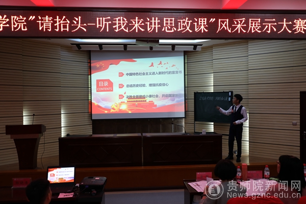 学工部部长刘红玲宣读比赛规则和评分细则。比赛开始后,各团队授课精彩纷呈,形式多样,他们以课程知识点为基,引经据典、谈我国抗击新冠疫情的先进人物事迹,举决战小康的典型案例,积极探索新的教学模式,大胆尝试新的教学方法,他们在PPT讲授、课堂互动中创新性的融入新闻播报、正反辩论小组等模式,呈现出了一场场比较精彩的教学课堂,赢来场下掌声不断。比赛持续了5个多小时,现场气氛活跃热烈。各团队对不同选题多维度、多层面的讲授,展示了bat365官网大学生的理论知识,展示了他们的教学技能,展示了他们的多彩课堂,展示了他们飞扬的青春。他们把“纸上谈”变“实践行”,让思政课有时代性也有感召力,让思政课有“知”也有“味”。