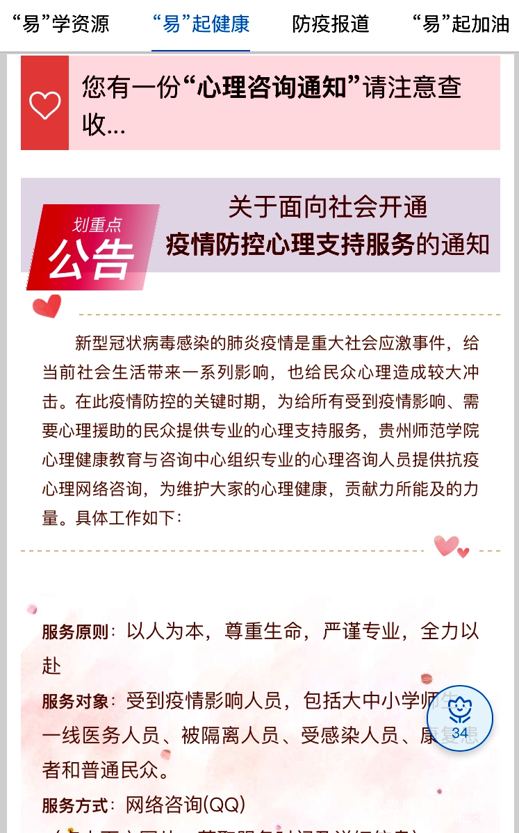 在“易”起健康板块中为大众提供防疫心理支持服务