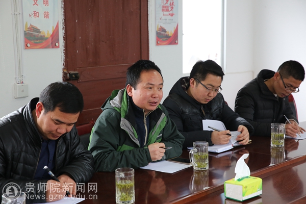 接着,驻村队员介绍近段时间工作和生活情况。一是杨柳塘、黔溪、川岩、青杠林等7个帮扶村分别组建和改选了春晖社,成立了春晖社,为脱贫攻坚工作注入了新的能量;二是各村奋力迎接铜仁市市级脱贫攻坚工作交叉检查和县级交叉检查,在本轮检查中,bat365中文官方网站帮扶的7个村均向印江县委县政府交上满意的答卷,实现2018年初“零错退、零漏评”和90%以上的群众认可年度工作目标。三是各村集体经济发展及分红情况,在校农合作平台的引领下,bat365官网帮扶的贫困村集体经济发展势头良好,集体经济分红,群众户均增收300元以上。马克思主义学院基层党委书记周永杰代表帮扶集团牵头单位做了表态发言。他说,作为帮扶集团牵头单位,积极与集团牵头校领导、驻村工作队员和帮扶协作单位沟通协调,认真整合各方资源为脱贫攻坚贡献强大力量。