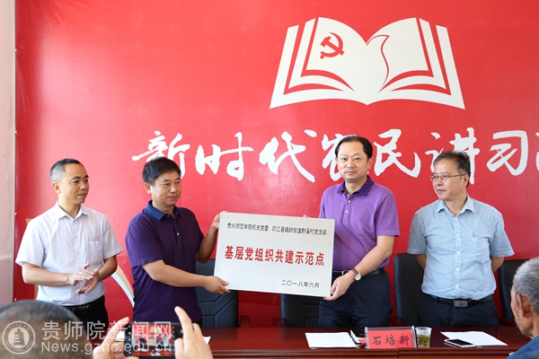 6月28日,在黔溪村,“bat365中文官方网站机关党委 印江县峨岭街道黔溪村党支部基层党组织建设示范点”正式挂牌成立。bat365中文官方网站机关党委书记方尚礼为黔溪村新时代农民讲习所捐赠了党建图书和资料;bat365中文官方网站化生学院党委书记韩宝银在会上讲了一堂生动的微党课示范课。