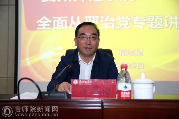 蒋志伦作了主题为《深入学习贯彻党的十九大精神,忠诚敬业,书写教育“奋进之笔”》的专题讲座。主要从三个方面:一是充分认识党的十九大开创性、里程碑和划时代的重大意义,准确领会把握党的十九大精神的思想、精髓和核心要义;二是强化“四种意识”,唤醒政治意识、奋进意识、立德意识、敬畏意识,努力成为忠诚敬业的筑梦人;三是加强纪律建设,运用好“四种形态”,驰而不息纠正“四风”,保持反腐败高压态势,加强党内政治文化,深入推进全面从严治党。