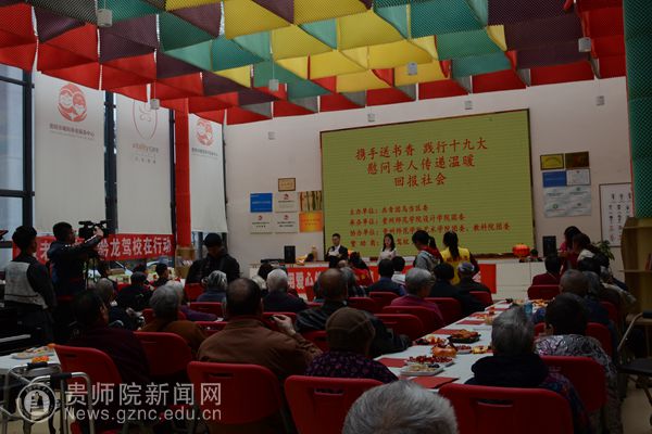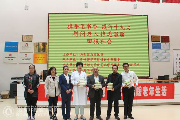 本网讯 雷锋活动月,携手送书香,践行十九大,慰问老人传递温暖。3月25日,共青团乌当区委书记郑玉霞、副书记周玮及工作人员;设计学院副院长聂森、团委书记黄美诤及师生代表;艺术学院、教育科学学院学生一行共65人前往贵阳曜阳养老服务中心开展“用爱心传承中华美德,让艺术温暖老年生活”的慰问活动。