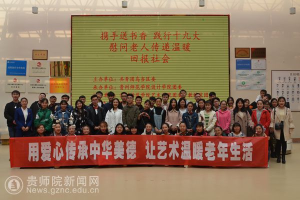老吾老以及人之老。继2017年11月设计学院学生去该中心开展慰问活动得知这里缺乏书籍汇报学院团委后,学院领导高度重视,号召全院老师和同学们捐书,并决定组织策划一场有特殊意义的活动,让老人们高兴的同时将同学们所学专业如扎染、剪纸、手工艺制作、书法、国画等运用到实践中。此次活动得到共青团乌当区委的大力支持,得到艺术学院、教科院的大力协助,得到黔龙驾校的倾情赞助。