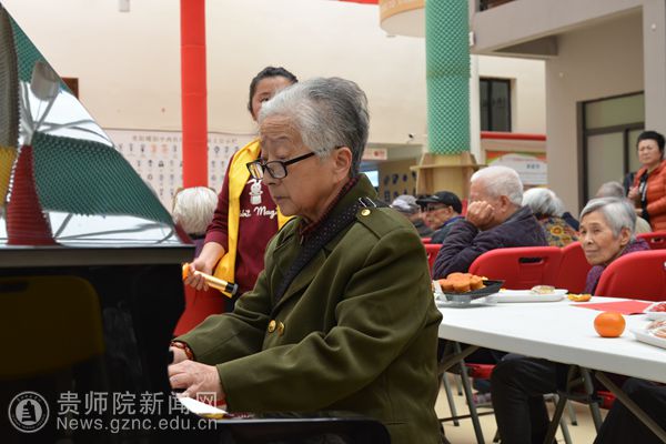 随后,艺术学院学生精彩演绎了舞蹈《民舞串烧》等节目,为现场老人们展示了一场精彩纷呈的文化盛宴。精彩的节目迎来老人们的阵阵掌声。老人们自发组织演唱的《没有共产党,就没有新中国》,更是将活动推向了高潮。饶曼云奶奶给大家带来钢琴演奏《我爱祖国》、《母亲》,琴声与听者的心灵撞击,扣人心弦,发生了强烈的共鸣与互动,现场洋溢着家的温馨,闪耀着爱的光芒。文艺演出在老人们动人的歌声《东方红》中画上了圆满的句号。