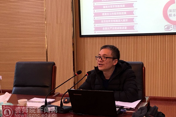 本网讯 12月25日,根据《贵州省委教育工委 教育厅关于<学习宣传贯彻党的十九大精神“七进”工作之进校园工作方案>通知》的要求,在逸夫楼艺术学院会议室,贵州省委教育工委高校马克思主义学院院长宣讲队成员、贵州财经大学马克思主义学院院长何伟福教授到bat365官网宣讲党的十九大精神,马列主义教学部教师代表、经济与政治学院思想政治教育专业学生代表80余人参加了学习报告会,学习报告会由马列主义教学部负责人王天桥主持。