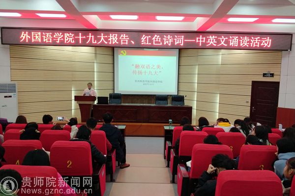 本网讯 11月24日,外国语学院在宁静楼150报告厅举行十九大报告、红色诗词——中英文诵读活动。本次活动由2017级英语二班李璟主持,年级辅导员张静、潘开艳及2017级全体学生参加了此次活动。