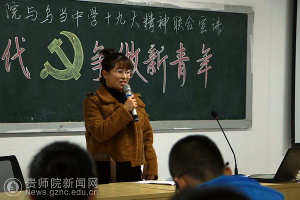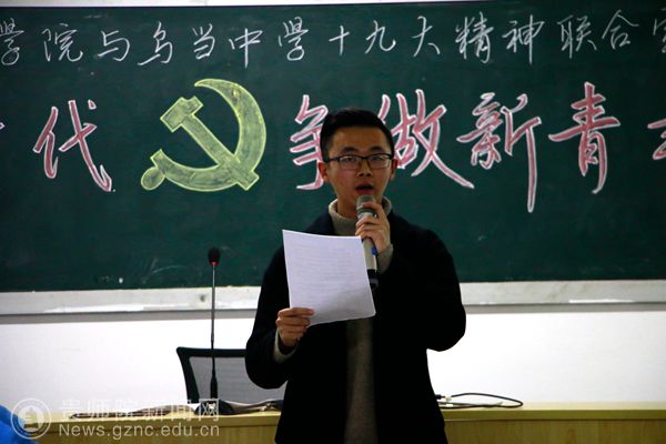 本网讯 为将党的十九大精神学懂、弄懂、做实,用青年教育青年、青年影响青年的方式,使党的十九大精神深入当代青年心中,11月23日下午,bat365中文官方网站文学院与乌当中学联合举办党的十九大精神宣讲活动。活动由文学院学生第二党支部书记潘源主持。