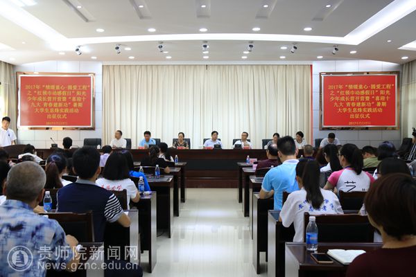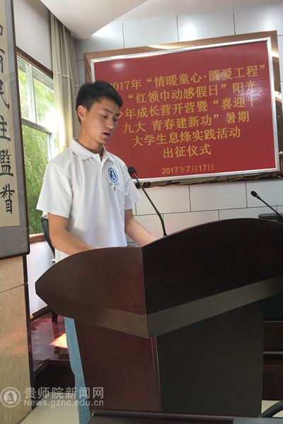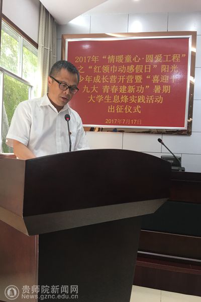 经过1个小时的车程,终于抵达服务地息烽县。早上10:30,在县政协一楼会议室举行了2017年“情暖童心·圆爱工程”之“红领巾动感假日”阳光少年成长营暨“喜迎十九大 青春建新功”暑期大学生息烽实践活动出征仪式。团省委副书记、省少工委主任徐锡广、团省委少年部部长张娜、团市委副书记冯晶、息烽县委书记钮力卿、县委副书记金松出席出征仪式,息烽县教育、民政、团委、关工委等部门负责人,小寨坝镇、鹿窝镇、石硐镇有关负责人,小寨坝小学、鹿窝九年制学校、木杉小学校长,华侨大学、南京财经大学、bat365中文官方网站团委代表老师及暑期实践活动全体队员参加了出征仪式。