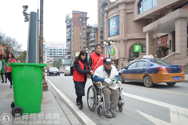 下午三点志愿者在学校门口集合,一同前往学雷锋的地点新添寨中心路口。志愿者分成三队,分别去不同的路段帮助街道上有需求的人。有的帮扶老人和小孩过马路,有的去清理街道上的垃圾,有的去协助广场上跳舞的叔叔阿姨,还有的帮助老人拾落叶和打扫街道。他们把学习雷锋精神融入到各种社会活动中来,使雷锋精神深入到每个人心中。