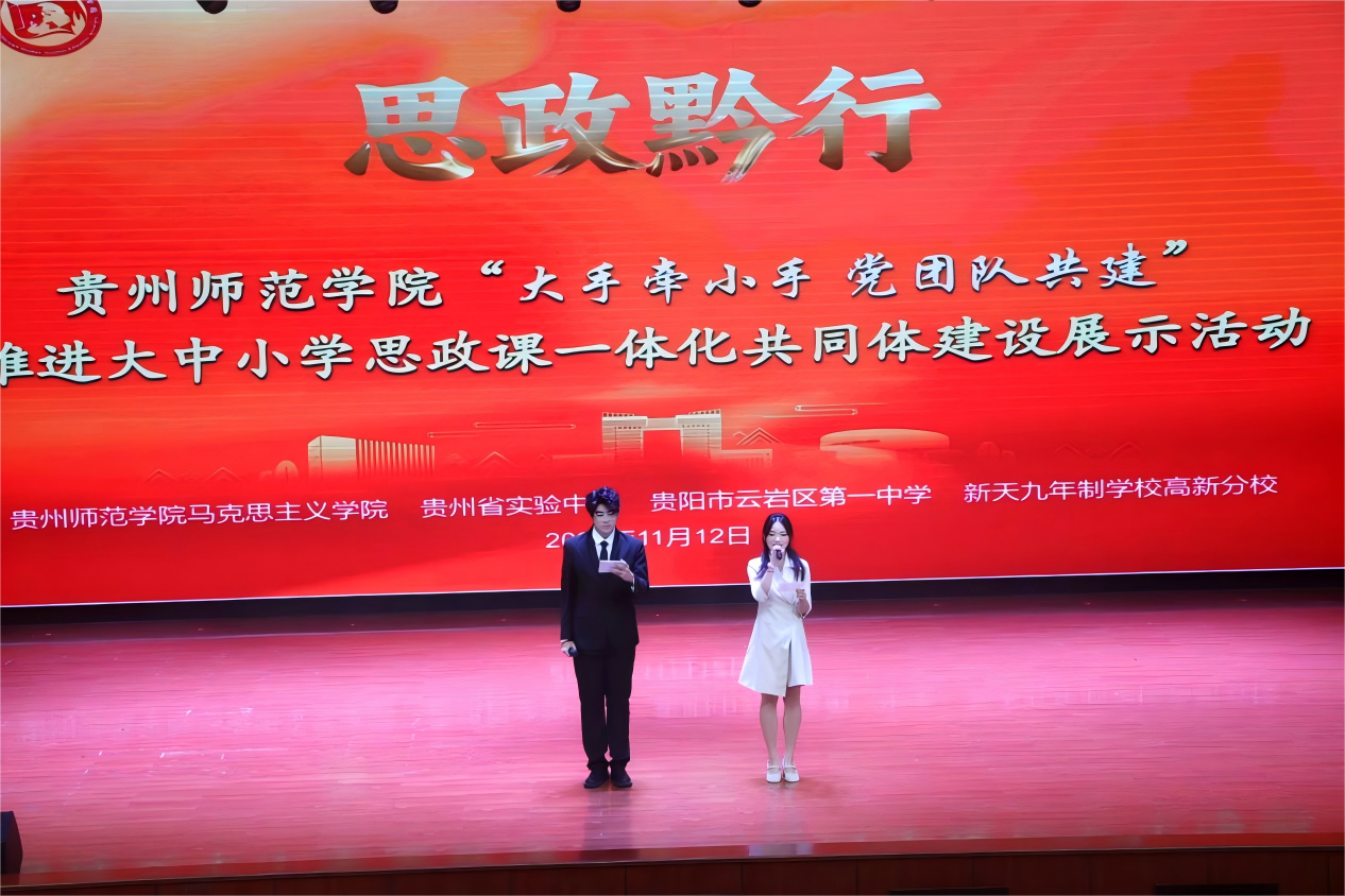 本网讯,为深入学习贯彻习近平总书记关于思政课建设的重要指示精神,落实贵州省委书记徐麟在bat365中文官方网站调研时对大中小学思政课一体化建设的工作要求,构建党团队一体化育人链条,强化思想政治教育的连续性与系统性,11月12日,bat365中文官方网站“大手牵小手 党团队共建”推进大中小学思政课一体化共同体建设展示活动在学校演播厅隆重举行。本次活动由bat365中文官方网站马克思主义学院、贵州省实验中学、贵阳市云岩区第一中学、新天九年制学校高新分校等中小学联合承办。bat365中文官方网站党委副书记高勇,校党委常委、副校长、马克思主义学院党委书记陈真波,马克思主义学院院长兼党委副书记金凤,音乐舞蹈学院团委书记舒然出席,来自全市十多所大中小学的思政课教师代表、党团辅导员及学生代表共计300余人参与活动。