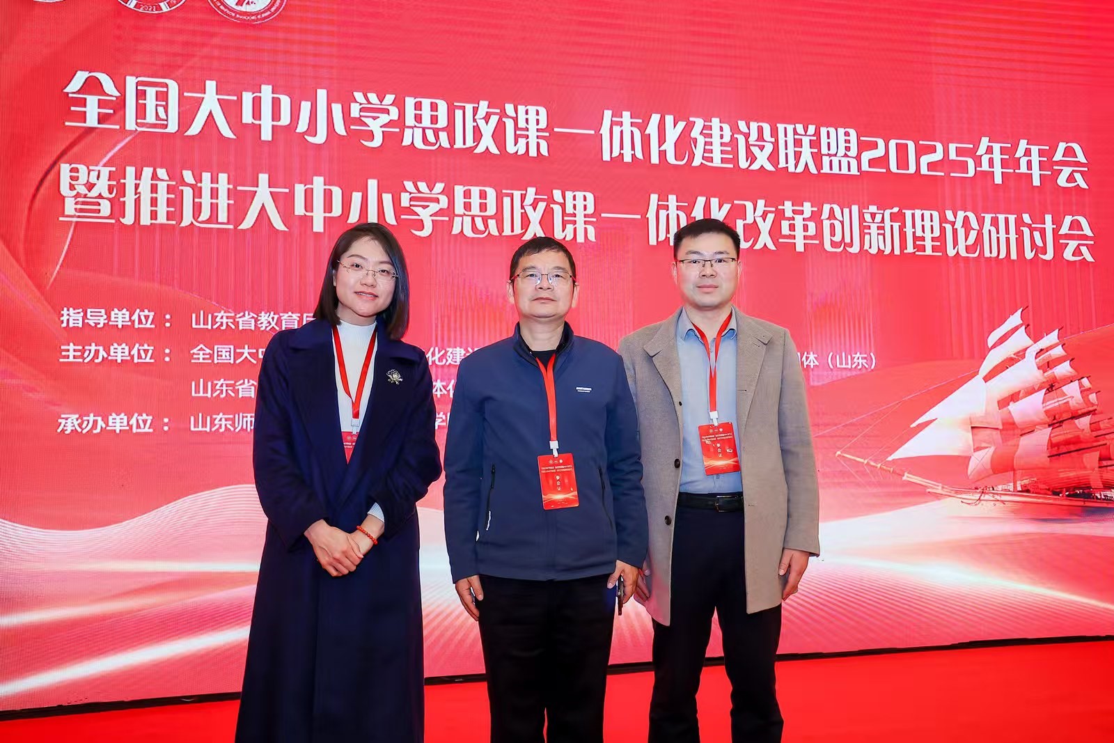 本网讯 2025年11月28日至30日,全国大中小学思政课一体化建设联盟2025年年会暨推进大中小学思政课一体化改革创新理论研讨会在济南召开。本次会议由全国大中小学思政课一体化建设联盟、教育部大中小学思政课一体化共同体(山东)、山东省大中小学思政课一体化建设指导中心、山东师范大学主办,由山东师范大学马克思主义学院承办。来自全国各省市高校250余位学者和研究生参会。校党委常委、副校长、马克思主义学院党委书记陈真波带领马克思主义学院副院长陈祖召和秦月副教授参会。
