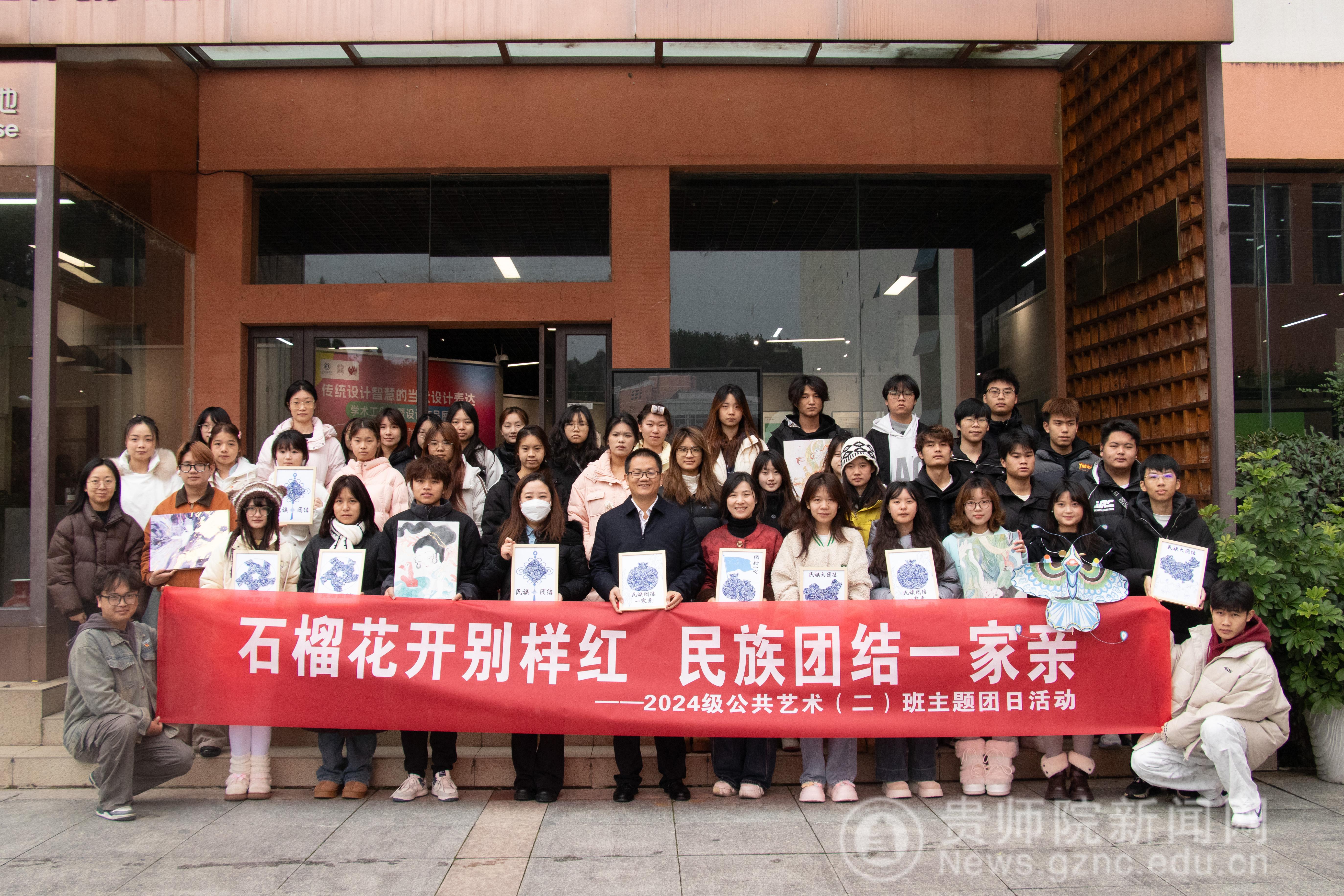 本网讯 为深入学习贯彻习近平总书记关于加强和改进民族工作的重要思想,12月3日,bat365中文官方网站美术与设计学院于艺术实践工坊精心筹备并成功举办了一场极具教育意义与专业特色的“民族大团结 共画同心圆”主题团日活动。校党委常委、副校长罗光杰,校党委委员、团委书记周煜,美术与设计学院党委书记郝进欣,院党委副书记邱琴,院团委副书记黄婧,辅导员欧俐岑以及2024级公共艺术二班全体同学齐聚一堂,共同参与此次活动。