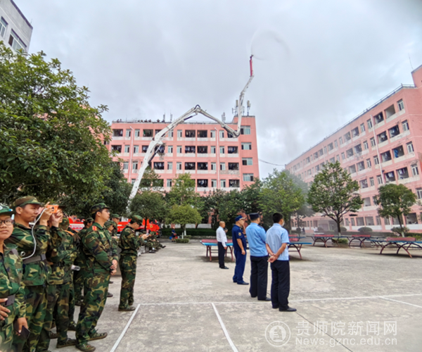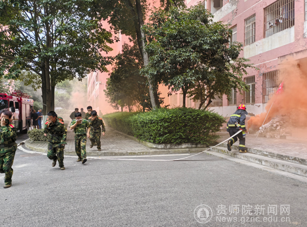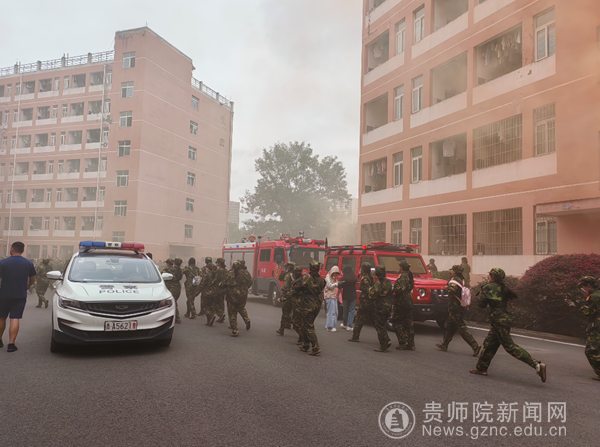 上午11点30分,2023级全体新生在体育场参加消防培训,校保卫处陈光俊对本次应急逃生演练活动做了具体安排和要求。中午13点40分,学校德园、兰园学生公寓应急逃生演练正式开始。“2023级新生应急逃生演练开始!”伴随着任洁副校长掷地有声的指令,消防警报响彻校园,乌当区消防救援大队消防员全副武装闻令而动,高空作业消防车立即向浓烟处实施灭火喷水;高新路派出所民警立即打开警笛,现场指挥师生有序疏散;全体保卫处同志和物管公司保安听令而行,指导同学们用衣物捂住口鼻,从宿舍高层到低层按照指定的路线快速、安全、有序的撤出现场。