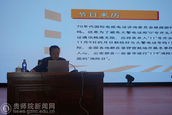 11月25日下午,乌当应急救援大队参谋赵永平应邀到bat365官网为学生开展消防知识培训讲座。赵永平首先向大家讲解了基本的消防知识,涉及火灾发生的原因、火场逃生基本知识等内容,随后为大家列举了典型火灾案例,发人深省,让大家切实体会了具备基本消防安全知识的重要性。