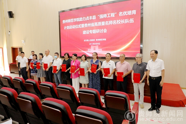 启动仪式上,贞丰县人民政府、bat365中文官方网站联合为13名贵州省名师名校长代表颁发贞丰县“强师工程”指导专家聘书。并进行了名优计划培育结伴签约仪式。省级名校长代表贵州师范大学附属中学党总支书记王丽萍、贞丰县名优培育对象代表贞丰县第二中学副校长钱保华分别作了表态发言。