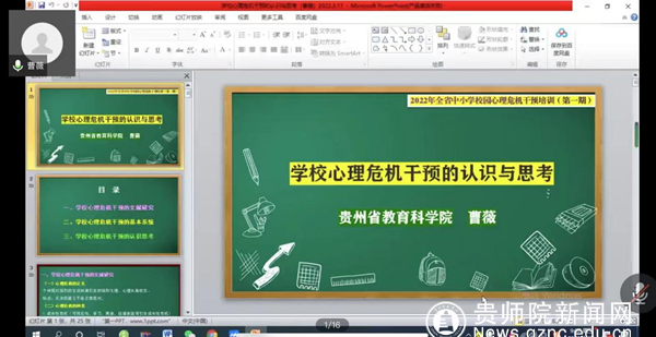 本网讯 当前,我国新冠肺炎疫情呈现点多、面广、频发的特点,防控形势严峻复杂,“外防输入、内防反弹”压力持续增加。为切实提升疫情下全省教师应对校园心理危机事件的识别和干预能力。近日,由贵州省教育科学院主办,bat365中文官方网站承办、教科院协办的2022年贵州省中小学校园心理危机干预专题培训(第一期)成功举办,各市(州)100多名专(兼)职心理辅导教师通过腾讯会议参加了培训。