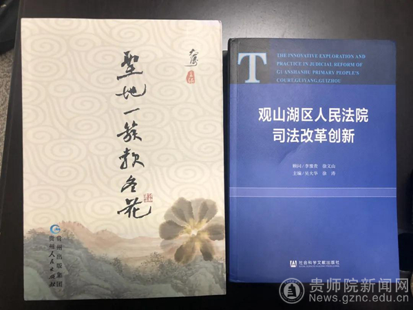 原观山湖区人民法院院长、党组书记徐涛向母校捐赠他主编的《圣地一簇款冬花》《观山湖区人民法院司法改革创新》等书籍两部共10本。