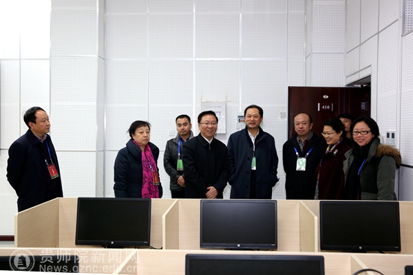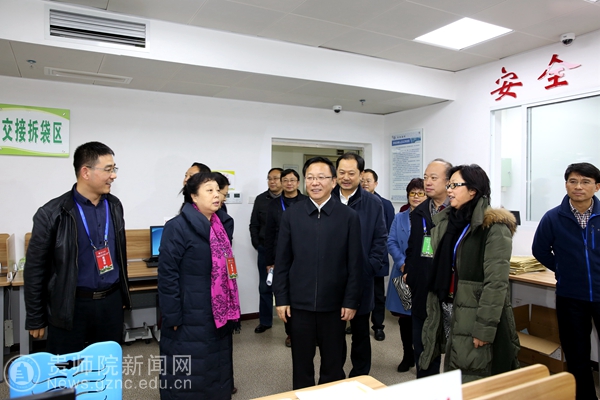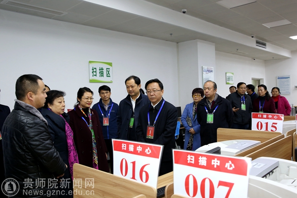 王凤友一行在校党委书记石培新、校长郁钟铭等校领导的陪同下实地考察了校评卷基地,巡视了扫描室、监控室等评卷场所。