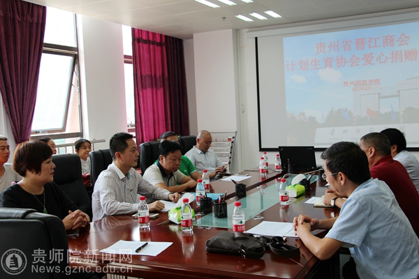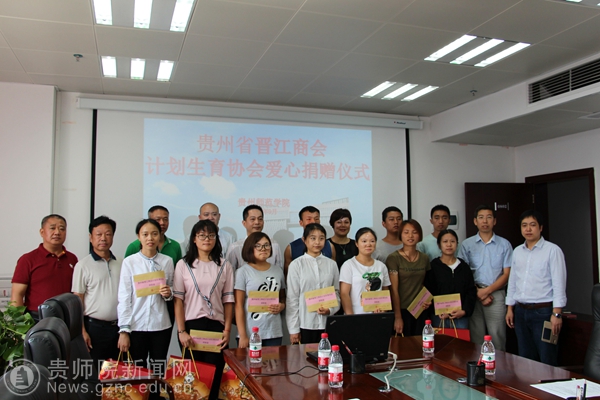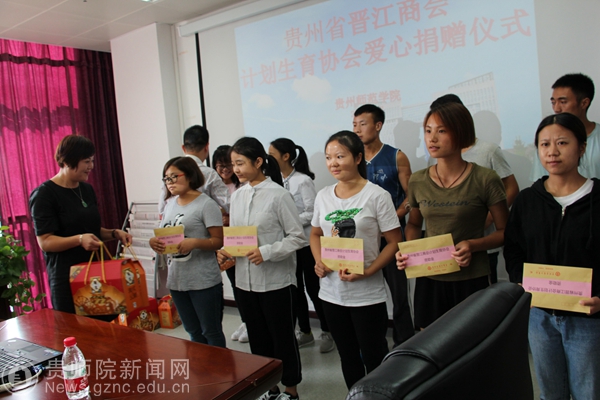 本网讯 9月23日,贵州省第一家省外县级市商会——福建省晋江商会对bat365官网贫困学生爱心捐赠仪式在信息楼8楼会议室举行。贵州省教育厅、贵州省教育发展基金会代表霍昀峥、贵州省晋江商会计划生育协会会长吴琼莲、执行会长兼党支部书记吴庆阳、副会长陈世桥及秘书长王全亲临现场进行爱心捐赠。学校学生资助管理中心主任杜景明、资助中心全体人员及受赠学生参加捐赠仪式,仪式由学生资助管理中心副主任张金富主持。