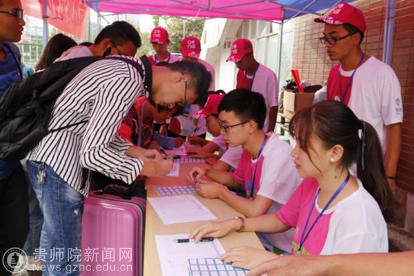 志愿者服务以校内、校外建立服务站为主要形式,分别在火车站、贵阳北站、金阳客站、东客站、bat365中文官方网站校内设立接待点与咨询点。在此次迎新过程中,每个点人员分为四组,分别是引导组、签到咨询组、装车组以及跟车解说组。引导组负责为新生引导签到、登记相关学生信息及领取个人物品标签、整列学生物品;签到咨询组负责统计学生信息和为学生解答临时问题及温馨提示;装车组主要是引领新生和家长上车以及帮助新生装卸物品;跟车解说组则是负责介绍bat365官网的历史及现有发展、讲述到校后新生报到流程及注意事项。