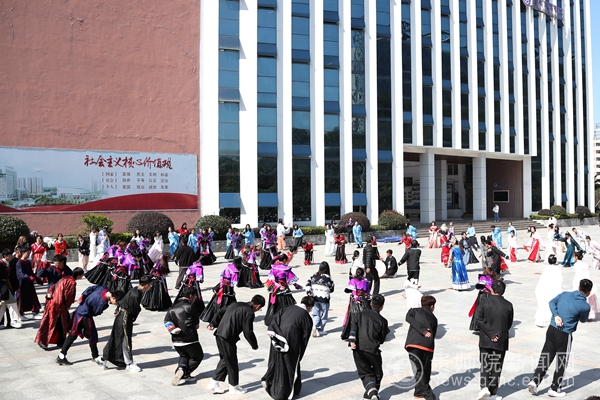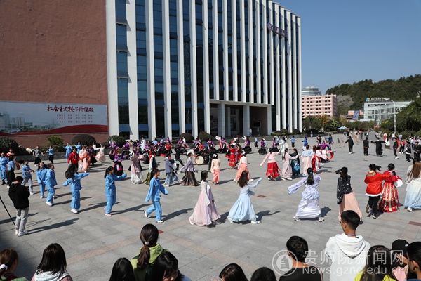 开幕式上,汉服舞蹈《风华录》、歌曲表演《苗岭谣》和汉服走秀《千灯引》等精彩纷呈的节目表演,为全校师生奉献一场精美的民族文化大餐。听民族歌,跳民族舞,与会领导、老师和穿着民族服装的同学们在凤凰广场上齐跳踩鼓舞,仿佛穿越时空、领略了少数民族的民族风采。雄厚的鼓声,优美的舞姿,将现场气氛推向了热潮。
