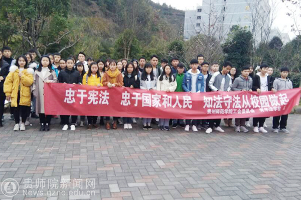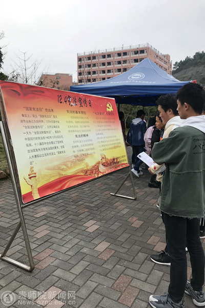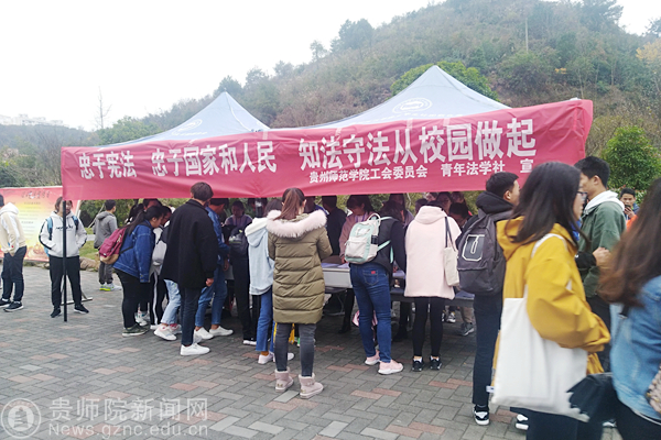 本网讯 12月4日在bat365官网鉴湖旁,由校工会主办、青年法学社承办,组织开展了“12.4”宪法宣传活动。活动旨在“弘扬宪法精神,建设法制师院,树立宪法意识,维护宪法权威”。本次活动主要是为了学习贯彻党的十九大精神,维护宪法权威,积极宣传与广大教职工利益密切相关的法律法规。