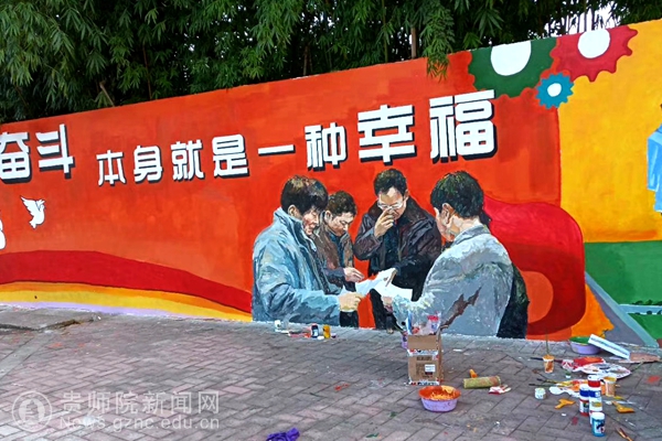 在接下来的两天里,同学们分工明确:有的负责构图,在墙体上勾勒出清晰的轮廓;有的负责调色,有的负责涂色,同学们拿起各式的画笔在墙体上细致涂刷,使得文化墙逐渐生动起来。经过三天不分昼夜的奋战,师生们互相配合,通力协作,精益求精,不断完善画面细节,最终圆满的完成了奋斗广场的壁画活动。