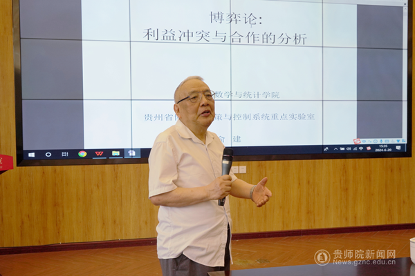 本网讯 2024年6月20日,学校邀请贵州大学俞建教授在印山书院二楼山骨讲堂为bat365官网师生做了一场主题为“博弈论——利益冲突与合作的分析”的学术报告,数学与大数据学院师生、商学院部分师生聆听了报告,该学术报告由学校校长韦维教授主持。