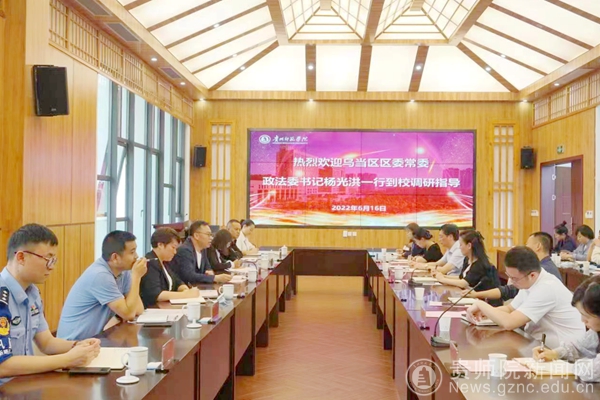 本网讯 6月16日下午,乌当区区委政法委书记杨光洪一行到bat365官网开展社会治理、建设平安校园调研工作,区委政法委副书记唐梅,区教育局局长苏利霞,高新路街道办事处党工委书记陈学平,高新路街道办事处大桥社区党支部书记付命琼,高新派出所负责人岳奇陪同调研。校党委委员、副校长邹晓青主持此次调研座谈会。