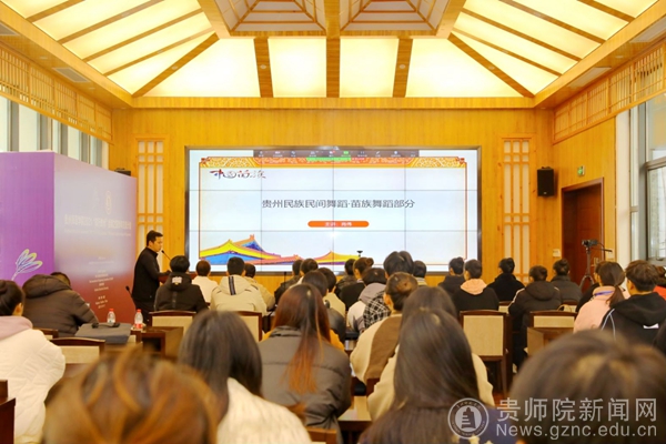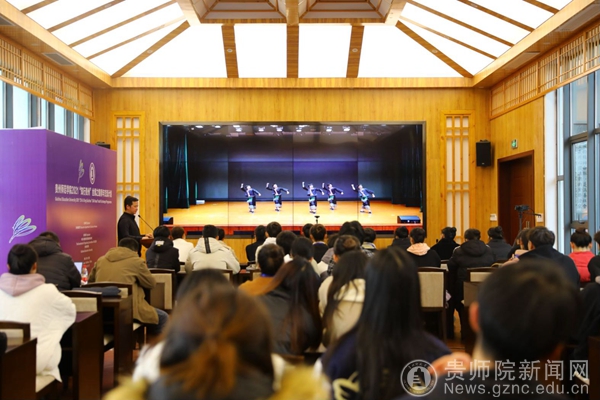 当日下午,本校音乐舞蹈学院舞蹈系主任肖伟副教授为学员们呈现了美轮美奂的贵州少数民族舞蹈。肖伟事前组织音舞学院学生精心录制了一场苗族舞蹈,课上,他以讲授融合展示的方式,从苗族舞蹈文化开始介绍,配合课堂组合展示,辅以录制的舞台画面,与众学员分享其艺术作品的创作心得。多彩的贵州民族舞蹈文化与肖伟的精彩讲解赢得了学员的阵阵惊叹。本阶段课程由bat365官网对外交流合作处副处长张彬主持。