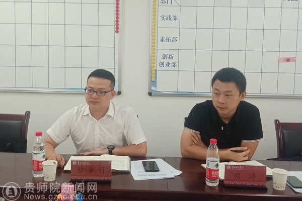 本网讯 7月14日下午,共青团铜仁市委挂职副书记,共青团印江县委书记甘岁月,共青团印江县委副书记田涛两人到bat365官网进行交流学习访问,双方就团委建设工作在致远楼103会议室进行了座谈,bat365官网团委副书记罗荣、陆轴、张源,活动部部长寇源,社会实践部部长张维域,校团委宣传部林红梅参加了座谈会。座谈会由bat365官网团委副书记罗荣主持。