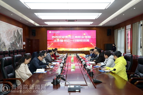 本网讯 11月26日下午,贵州工商职业学院党委书记王永福、校长周刚一行到bat365官网考察交流,bat365官网党委书记石培新、副校长郭文、纪委书记 邬卫东等校领导热情迎接了王永福一行,在信息楼二楼会议室举行了两校交流座谈会,会议由郭文主持。