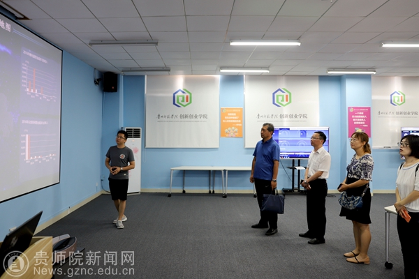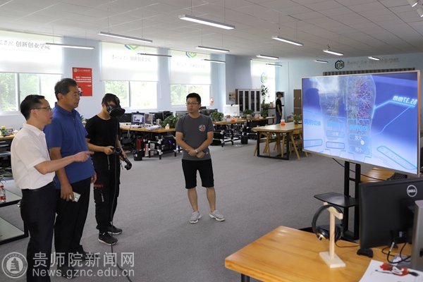在我院教师陈非帆的介绍下,还分别参观了我院师生团队自主开发的贵州省创新创业地图、创新创业数字化管理平台、智慧医疗项目、人工智能应用及MR教学系统等多个项目。