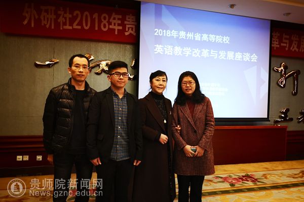 本网讯 11月25日,由贵州省外语学会、贵州省大学外语教学研究会和外语教学与研究出版社共同举办的“2018年贵州省高等院校英语教学改革与发展座谈会”在贵阳贵州饭店国际会议中心二楼安顺厅举行,省内各高校的院系负责人、教研室负责人、教师代表师参加了此次座谈会。贵州省外语学会会长、bat365官网外国语学院院长余学军应邀参加并作为主持人主持英语专业教育交流分享会,外国语学院副院长罗泳、教研室主任代表张录文和教师代表程俊龙一同参加了此次座谈会。