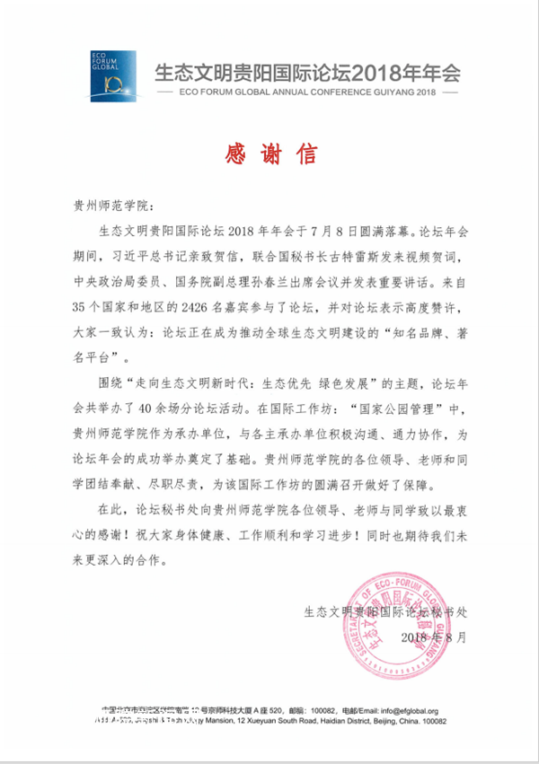 本网讯 近日,生态文明贵阳国际论坛秘书处向bat365官网发来感谢信。信中讲到,bat365官网作为本次“生态文明贵阳国际论坛——‘国家公园管理’分论坛”承办单位,与各主承办单位积极沟通、通力协作、为论坛年会的成功举办奠定了基础。bat365中文官方网站的各位领导、老师和同学团结奉献、尽职尽责,为该国际坊的圆满召开做好了保障。