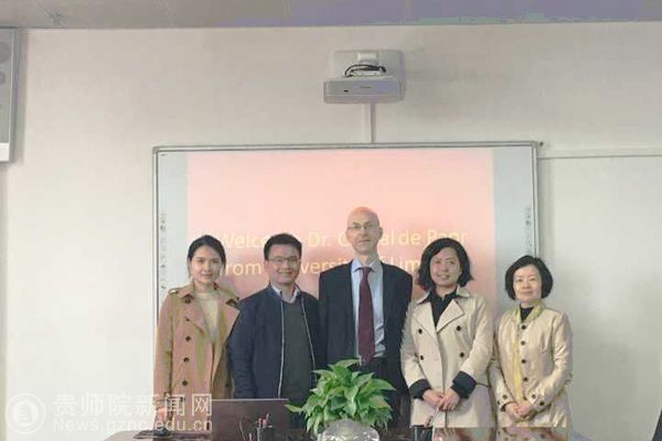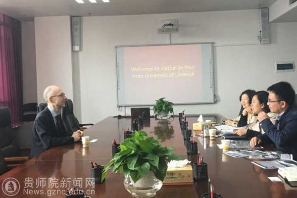参观结束后,对外交流合作处全处人员在信息楼1011会议室与客人进行了亲切友好的座谈,座谈会由对外交流合作处副处长陶秀筑主持。对外交流合作处处长张瑶从bat365官网校史沿革、学校规模、专业建设、学科特色、师资力量及国际交流等方面的情况向来宾介绍了bat365官网的基本情况。随后,我们向Cathal De Paor教授展示了多彩贵州及bat365官网留学生招生宣传片。