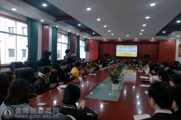 潘希兰首先对宋万琚、陈震等前来参加实习总结会表示热烈欢迎,对实习生的认真学习、踏实工作、无怨无悔的实习表现予以高度赞扬,对他们的实习收获表示由衷的祝贺,对实习生的努力和付出表示衷心的感谢,希望同学们与贵阳十九中学的领导和老师们保持联系,实习虽然结束,但情谊继续。