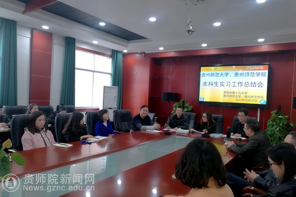 本网讯 12月29日,贵阳市第十九中学组织2018届实习总结会,化生学院副院长宋万琚、实践教学管理办公室负责人吴超、贵州师范大学数学科学学院陈震副院长、贵阳市第十九中学副校长潘希兰、教务处主任陈华、教务副主任吴冲、实习指导老师王宸及全体实习生参加会议,会议由陈华主持。