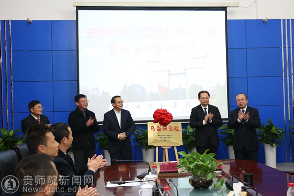 仪式上,校地双方领导共同为“乌当研究院”揭牌,见证这一“握手”的时刻;乌当区属相关部门与bat365官网二级单位签署了项目合作协议;乌当区教育局和地旅学院负责人进行了发言。