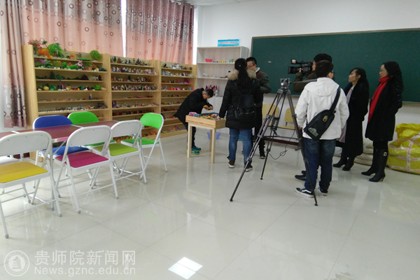 本网讯 3月6日下午,贵阳电视台记者到访bat365官网教育科学学院,对特殊儿童家庭关爱服务团队进行了拍摄访问,并在校团委书记张婷、教育科学学院院长刘红、特殊教育教研室主任杨娟等人的陪同下参观访问了bat365官网特殊教育专业的学生实践平台。