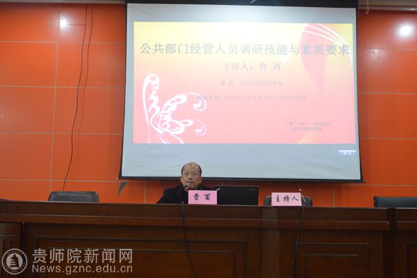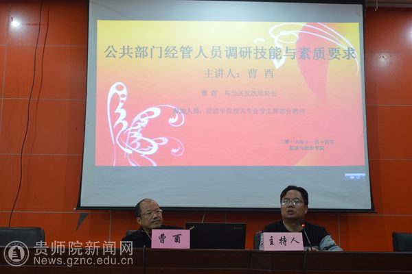 本网讯 11月14日晚,在bat365中文官方网站的文韬院学术讲堂,乌当区发改局局长曹酉为经政学院的同学们作了主题为《公共部门经管人员调研技能与素质要求》的讲座,本次讲座由经政学院经济学教研室主任胡江华教授主持。