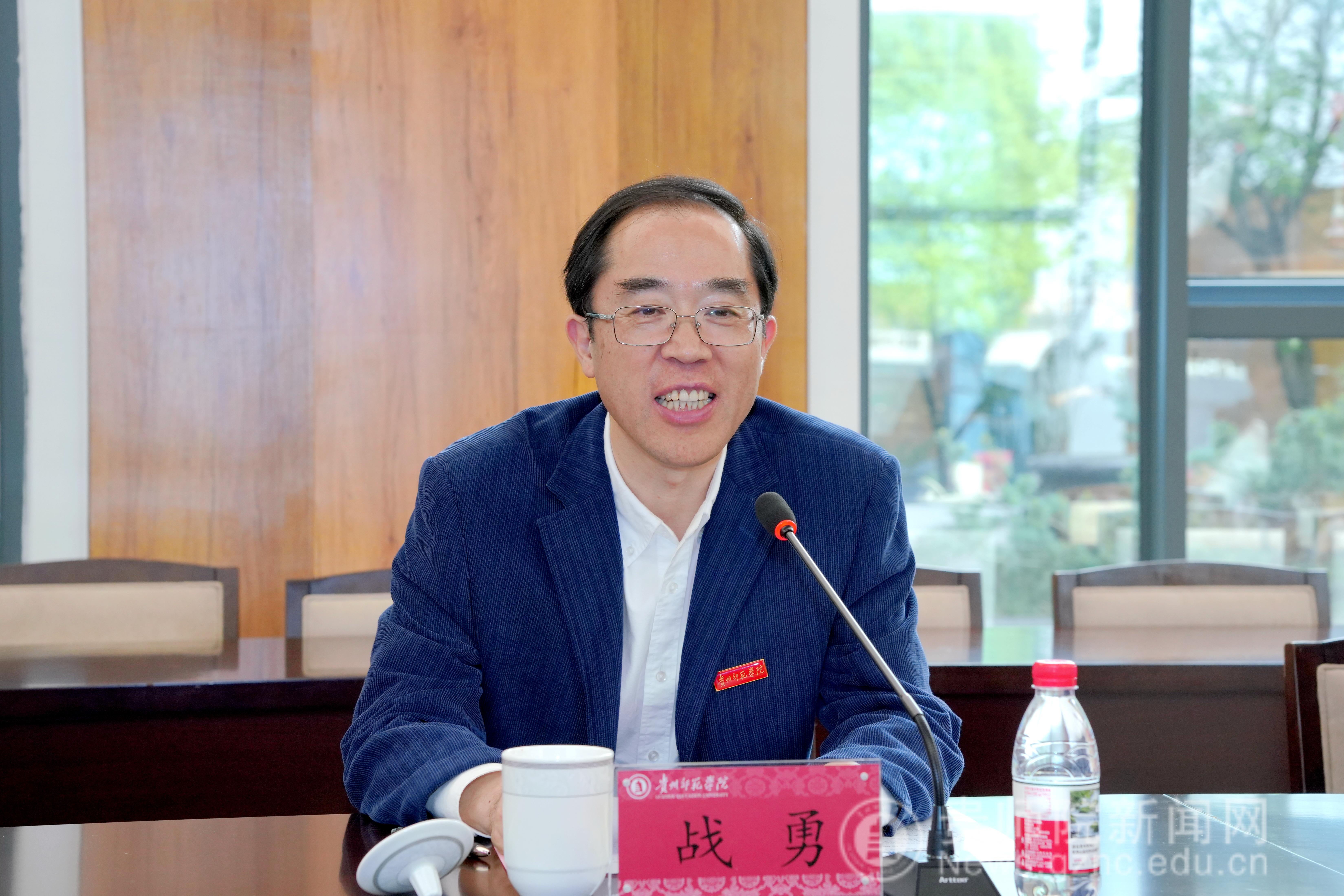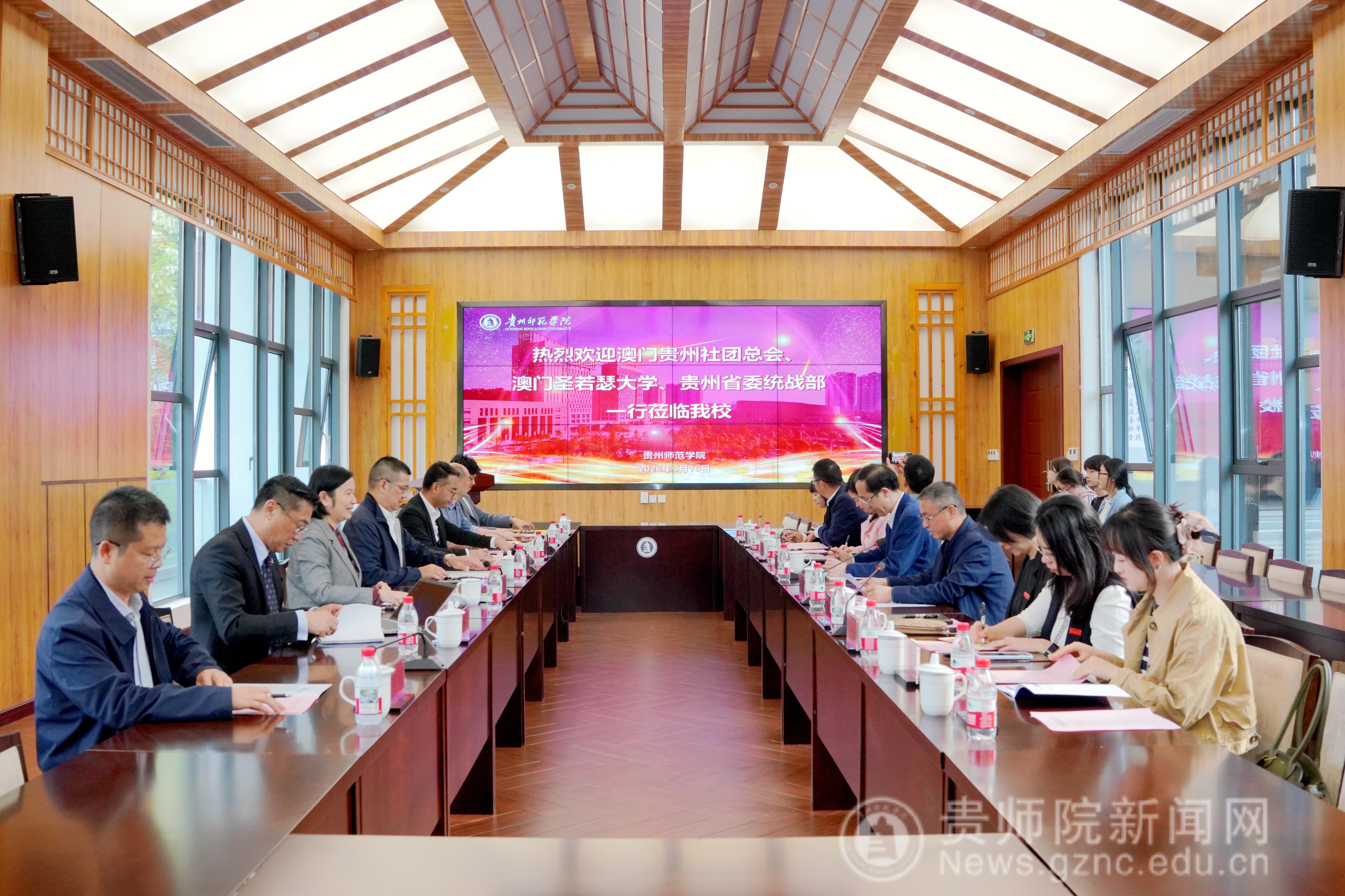 本网讯 4月16日下午,澳门贵州省政协常委、澳门贵州社团总会会长区柏来,澳门圣若瑟大学副校长农韵淇,贵州省委统战部三处处长孔祥龙等一行到访bat365官网。bat365官网党委书记战勇,校长王蜀黔,党委常委、副校长(正厅长级)赵守盈热情接见来访嘉宾,战勇陪同参观校园并出席座谈会,座谈会由赵守盈主持。