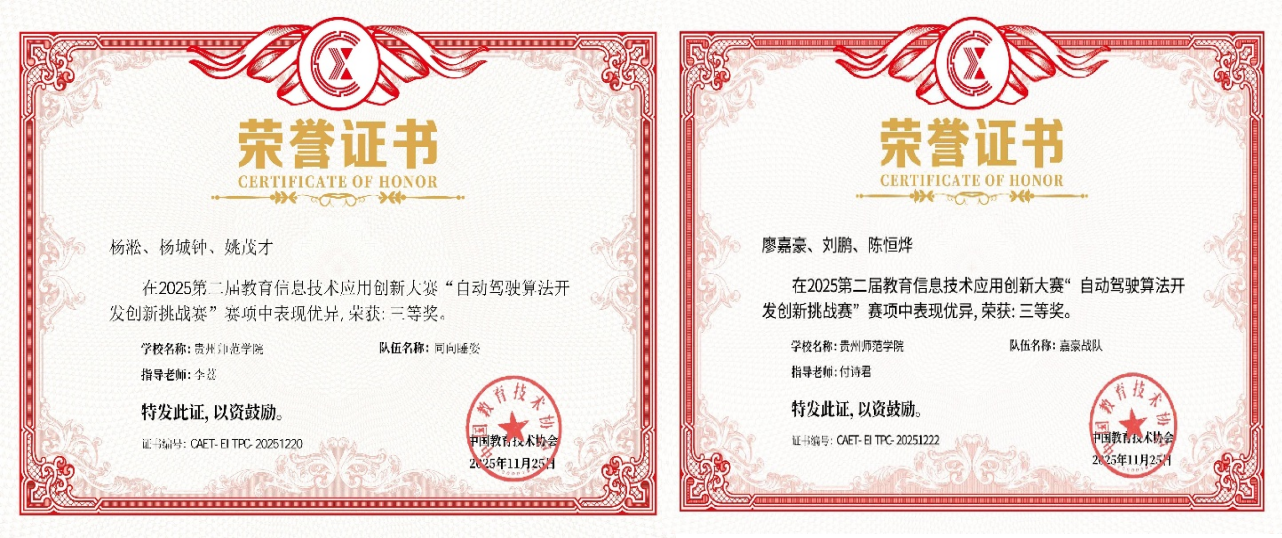 bat365中文官方网站物理与电子科学学院集成电路专业“奇点战队”在“自动驾驶算法开发创新挑战赛”中表现卓越,荣膺全国一等奖,并获5000元奖金;“嘉豪战队”与“同向睡姿战队”分别荣获全国三等奖。此成绩充分彰显了学校在信创与AI自动驾驶交叉领域的教学创新及实践成效,亦标志着学校在“课程—实训—竞赛—认证”四级一体化人才培养模式方面实现初步突破。作为集成电路现代产业学院建设的重要实践,参赛团队凭借国产芯片(如飞腾派)及开源软硬件平台,完成多场景任务的设计与开发,有力推动了教学内容由理论向实践的跨越,增强了学生在真实产业环境中的技术应用能力。