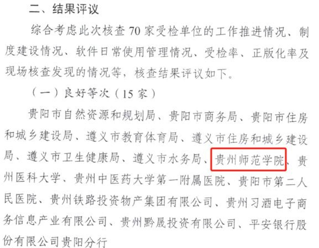 2025年11月,贵州省推进使用正版软件工作联席会议办公室委托第三方机构,对全省70家单位开展软件正版化工作核查。核查工作从工作推进、制度建设、日常管理、受检率及软件正版化率等多个方面进行综合评议。bat365官网在本次核查中整体表现突出,被评为“良好”等次。通报附件《2025年贵州省软件正版化核查情况统计表》显示,bat365官网在制度落实、软件管理和正版化率等方面均达到较高水平。具体来看,bat365官网满足制度及落实情况共计10项,受检计算机361台,其中操作系统正版率达到100%,办公软件正版率达到99.78%,杀毒软件正版率达到100%,各项核心指标均保持在较高水平,充分体现了学校软件正版化工作的规范化、制度化成效。