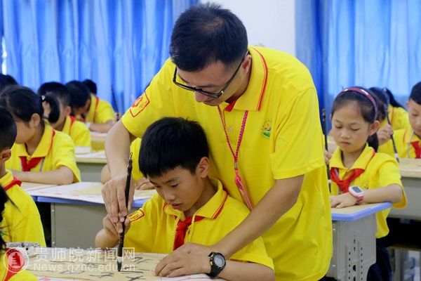 汉字书法为中国文化的独特表现艺术,被誉为:无言的诗,无形的舞;无图的画,无声的乐。“跟着魏老师玩毛笔”,由浙江省陶研会副会长、秘书长、浙江省师干训中心办公室主任、全国陶研界著名书法家魏建刚老师的专家团队执教。7月23日正式开课后,学生、家长、志愿者以及金海湖的老师们每天都会“恋一恋”,不知不觉中,我们爱上了书法,爱上了中国文化。同学们学着老师的样子,认真地调整握笔姿势,时不时和老师互动,饶有兴致地喊着老师教的正确握笔的口号:“手直腕平!”老师们不时的将同学们的创作成果拿出来作展示,现场掌声不断。金太阳之家的刘博弈同学在自己的纸上写下自己旁边同学的名字,老师将他的作品拿出来展示,引得同学们一片笑声,专家老师作了讲评后,鼓励他要多写多练:“写得有待提高啊,但是写的很清晰,下去多写多练,一定可以写的更好”,这时,同学们响起了掌声。