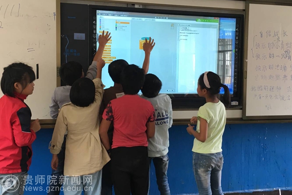 志愿者在指导学生用Arduino Scratch图形化编程