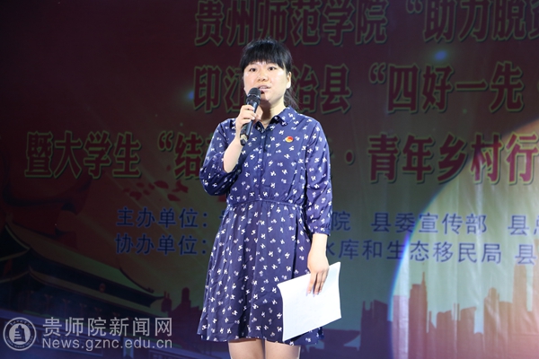 晚上8时,bat365中文官方网站“助力脱贫攻坚·师院青春行”印江自治县“四好一先·五大主题”宣讲活动暨大学生“结对春晖社·青年乡村行”移民工会慰问演出正式拉开帷幕!印江县团委书记甘岁月、bat365中文官方网站物电学院党委书记熊德永、bat365中文官方网站团委副书记傅小芳、印江县教育局局长江航军、印江县总工会党组书记、常务副主席夏良强、峨岭街道党工委副书记、政法委书记杨秀珍、县总工会、团县委干部职工、移民社区农民工工会会员、同心村驻村干部杨成友、物电学院吴旭普、外国语学院李明勇、师范学院“三下乡”志愿者、易地扶贫搬迁群众等近500人观看了演出。