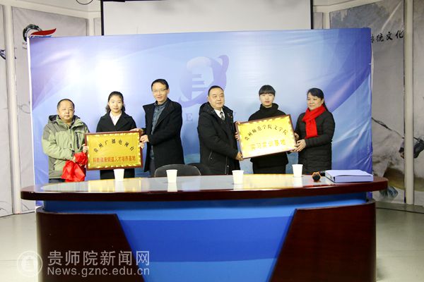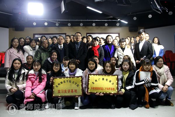 本网讯 12月20日,文学院与贵州广播电视台科教频道共建学生实习实训基地揭牌仪式在宁静楼627演播厅举行,标志着文学院在校企合作方面迈出新的步伐。文学院党委书记韦丹、文学院院长吴俊、贵州广播电视台科教健康频道总监刘康翔、《走遍贵州》制片人赵海以及文学院广电、广编教研室部分教师出席了揭牌仪式,我院16级广播电视学、广播电视编导班的学子积极参与了本次活动。此次揭牌仪式由我院2015级广播电视编导班朱昆同学主持。